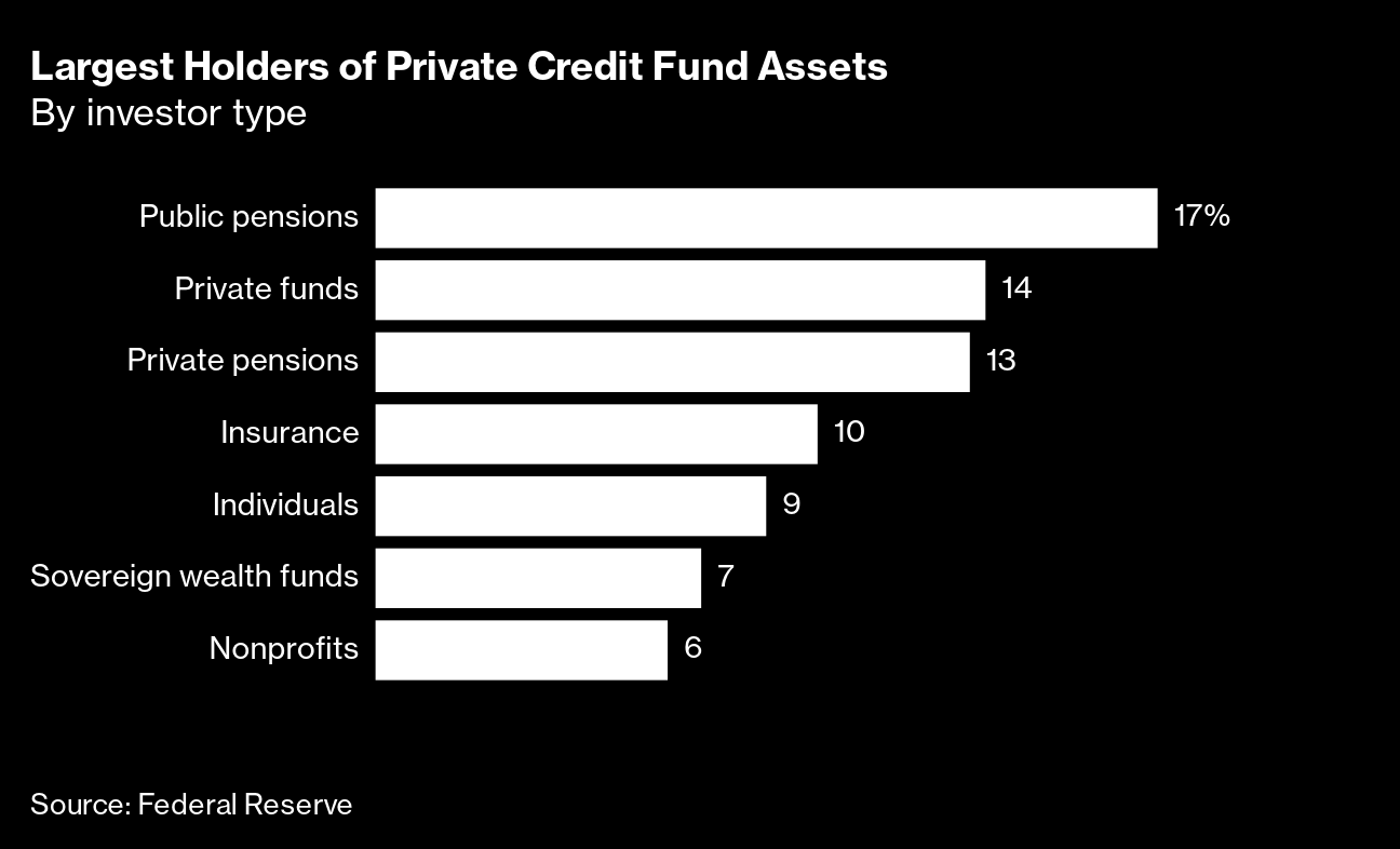 私人信貸是該計劃的關鍵部分。黑石集團管理着約300億美元的此類資產,這一數字可能會隨着一些銀行退出向中型企業貸款而增長。根據Preqin的數據,截至2022年9月,全球私人債務已經從2010年的約3000億美元激增至1.5萬億美元。根據美聯儲的五月報告,截至2021年,公共和私人養老基金持有約31%的私人信貸資產。