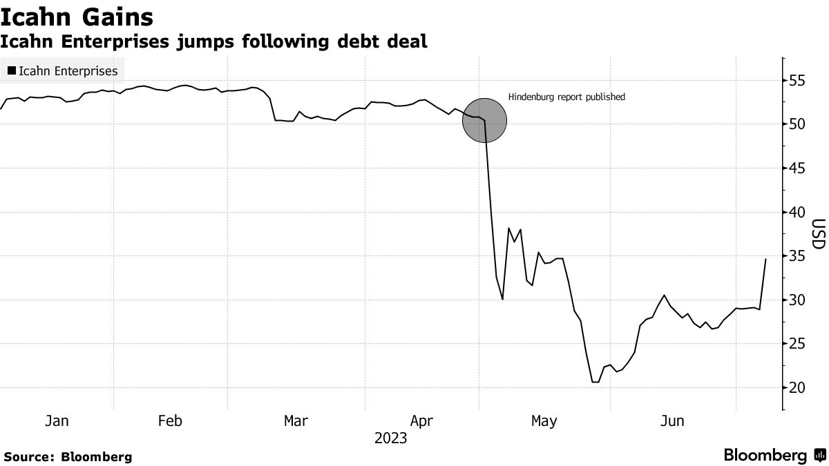 伊坎企業的股價在紐約交易中飆升20%,至34.69美元,將這位激進投資者的淨資產提高到了111億美元,根據彭博億萬富翁指數。