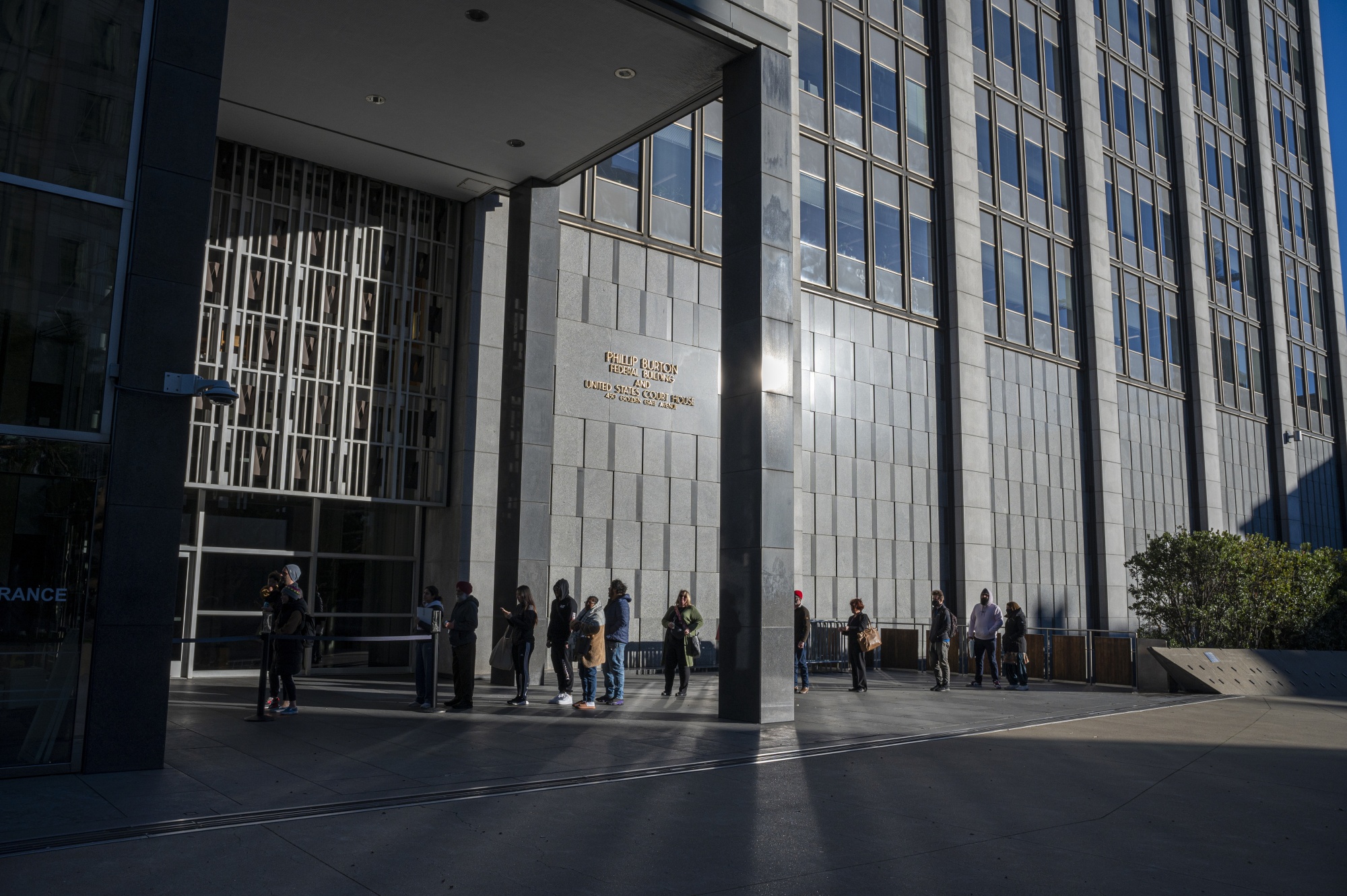舊金山的菲利普·伯頓聯邦大樓和美國法院。攝影師:大衞·保羅·莫里斯/彭博社隆巴迪與美國地方法官傑奎琳·斯科特·科利的19樓法庭上,還有Balyasny資產管理公司、城堡企業美洲公司、Pentwater資本管理公司、TIG顧問和United First Partners等公司的代表。這個約有十幾人的團隊經常佔據公共座位區的前三排。一些人付給排隊者每小時30到40美元來保持他們的位置。數十名同行通過Zoom音頻提供的法庭行動。