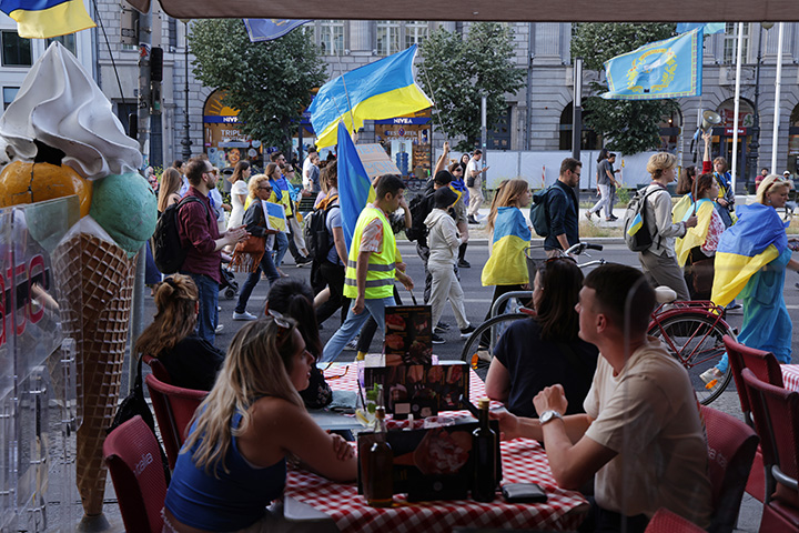 餐廳裏的食客們觀看示威者手持烏克蘭國旗遊行,以紀念2014-2022年烏克蘭東部分裂戰爭中馬裏烏波爾的解放,在6月13日的柏林。