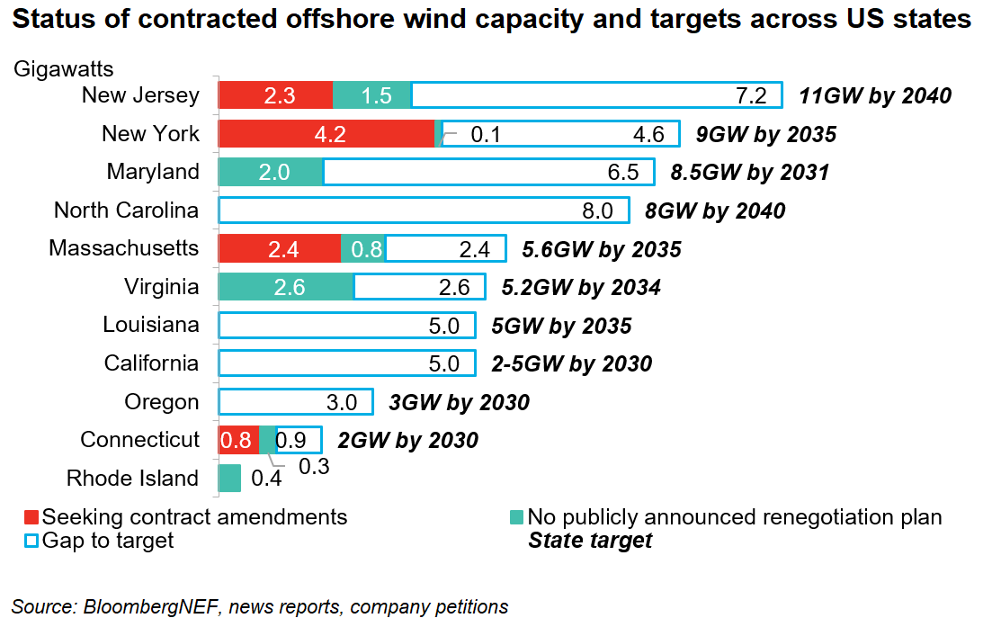 交易修訂 | 由於項目開發商援引成本上升,試圖重新談判或取消合同,導致幾個美國州錯過了其海上風電目標的風險日益增加。(彭博新能源財經)