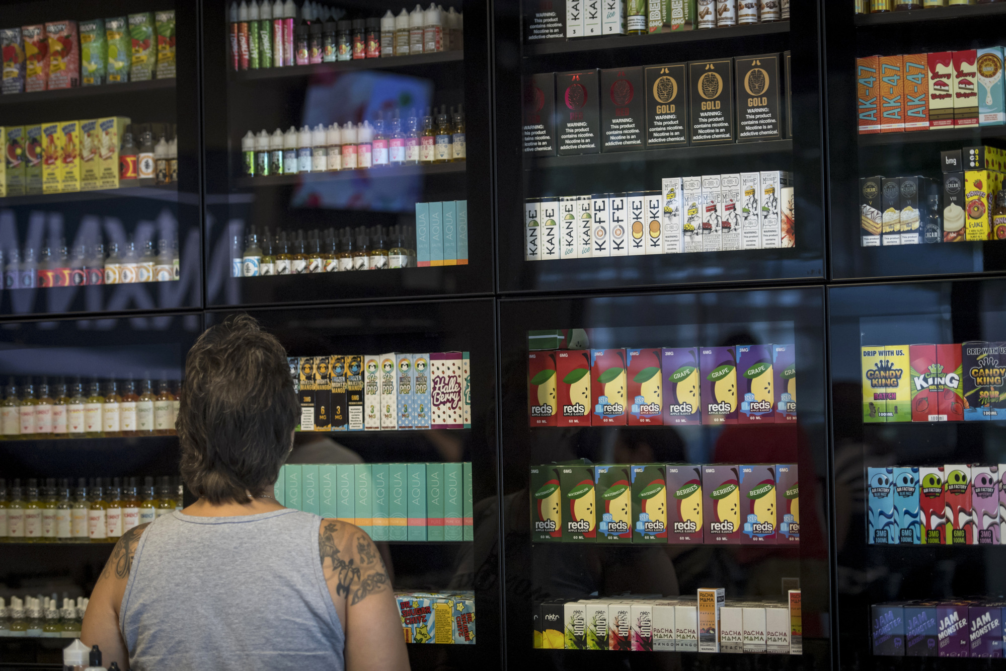 一位顧客在加利福尼亞州薩克拉門託為電子煙瀏覽各種口味的霧化果汁。
