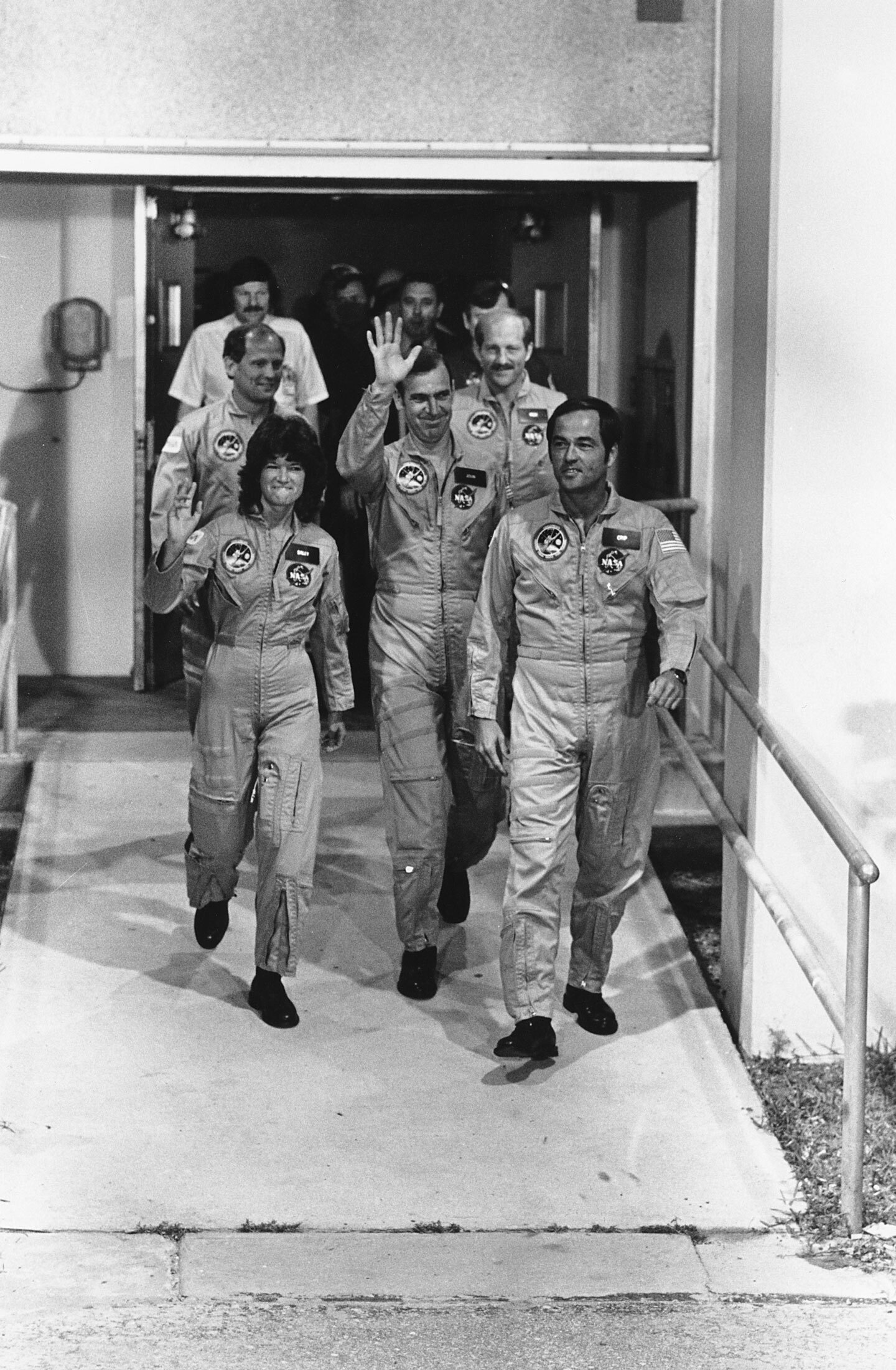 航天飛機挑戰者的機組人員於1983年6月18日清晨在佛羅里達州肯尼迪航天中心登機。Ride和Crippen在前面,John Fabian在中間,Norm Thagard和Rick Hauck在後面。來源:AP照片Abbey説最好的宇航員獲勝了。“結果表明,莎莉是最合格的,”他説。“沒有其他男性或其他女性能像她一樣擅長遠程操作器。”最終,Kraft同意了。