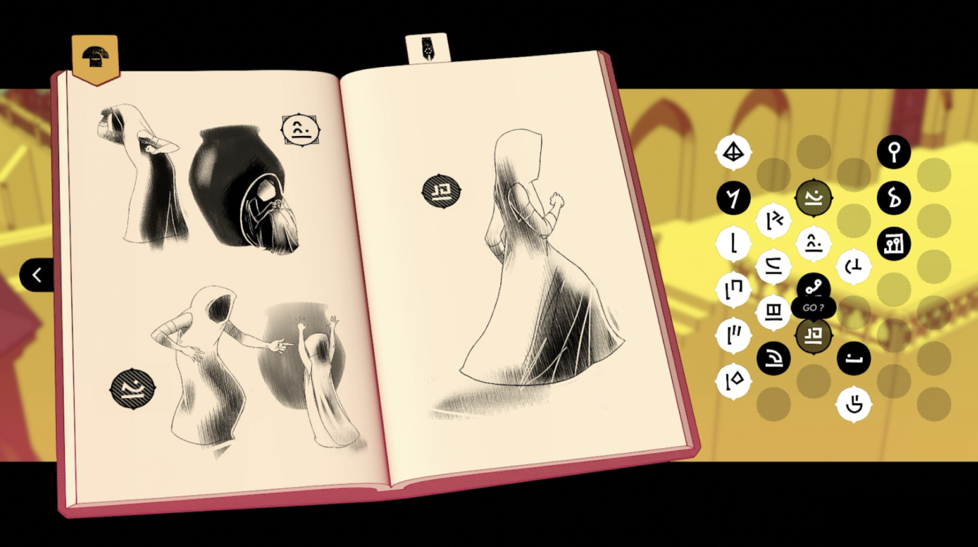 *《森納爾之歌》*讓玩家通過邏輯和上下文線索來解密一系列基於象形文字的語言。商店外掛着的招牌可能教會你“藥水”的單詞,而教堂裏的畫作揭示了一個部落稱之為“神”的東西。遊戲結束時,你將解密了來自五個不同族羣的五種語言,並讓它們團結起來,教導它們如何溝通並找到彼此語言中的共同點。