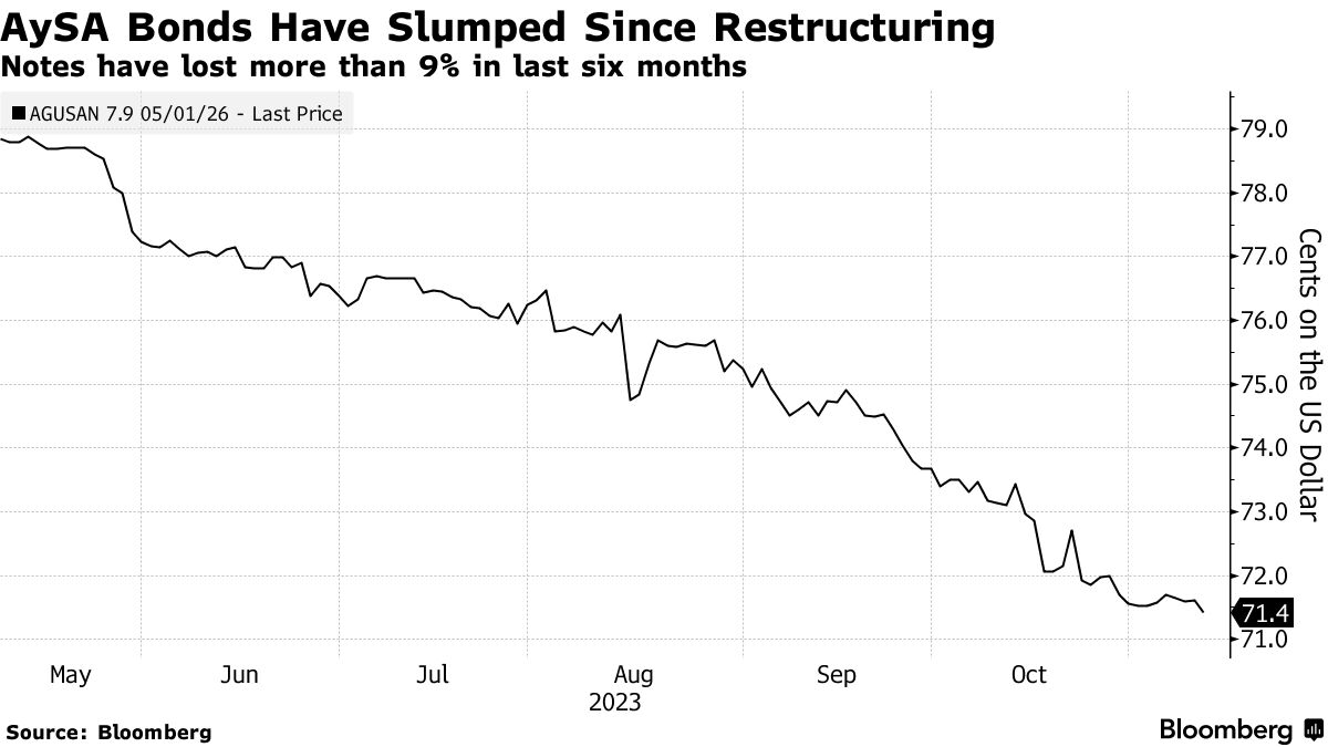 AySA向布宜諾斯艾利斯市及其26個郊區的1400萬居民提供飲用水和污水服務。該公司去年重組了其債券,將到期日延長至2026年,目前大約欠債3.3億美元,自5月以來債券下跌超過9%,交易價格約為面值的71%,據彭博編制的數據顯示。