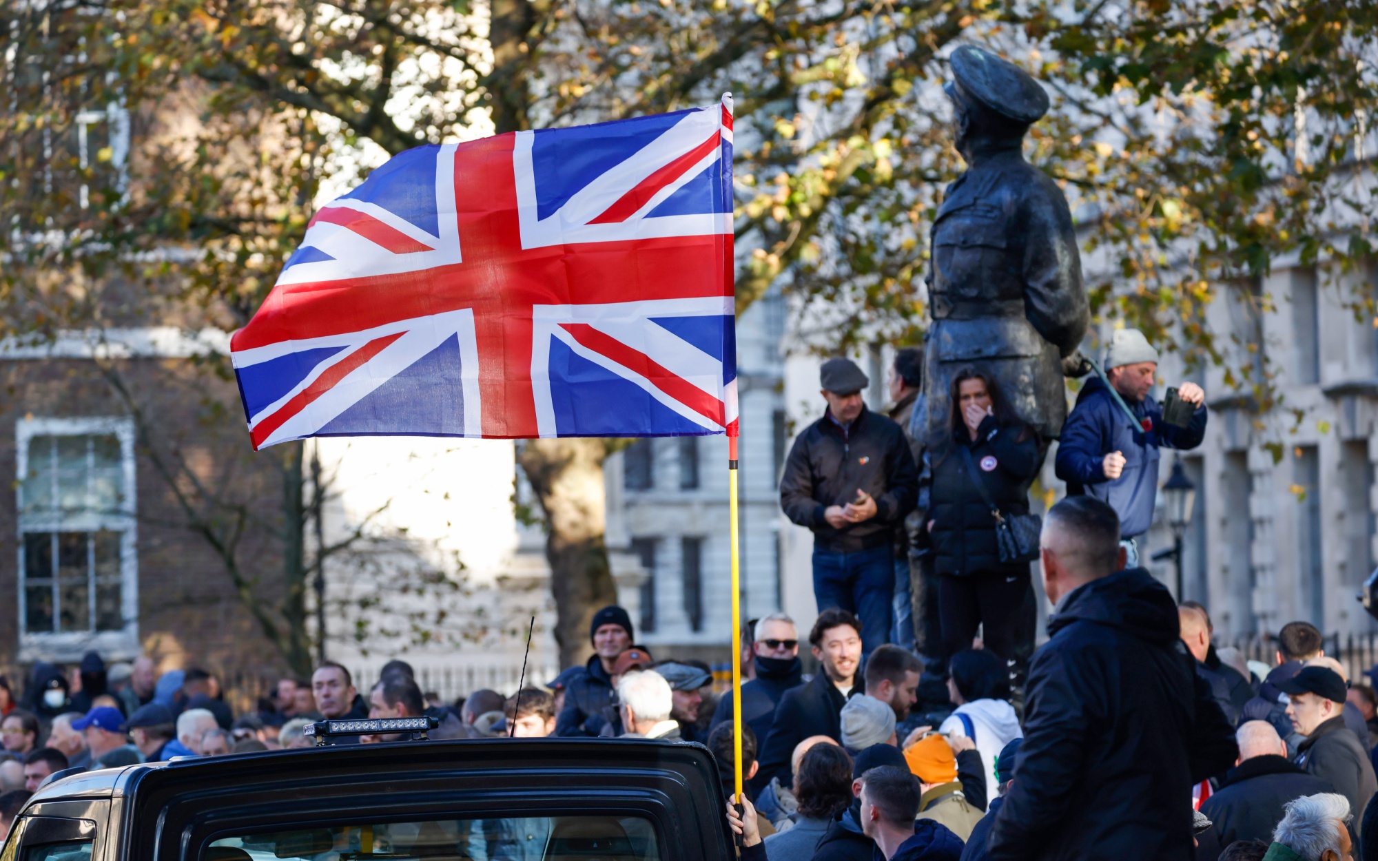 公眾人士攜帶着英國聯盟旗幟在倫敦的停戰日向戰爭中的人們致敬。