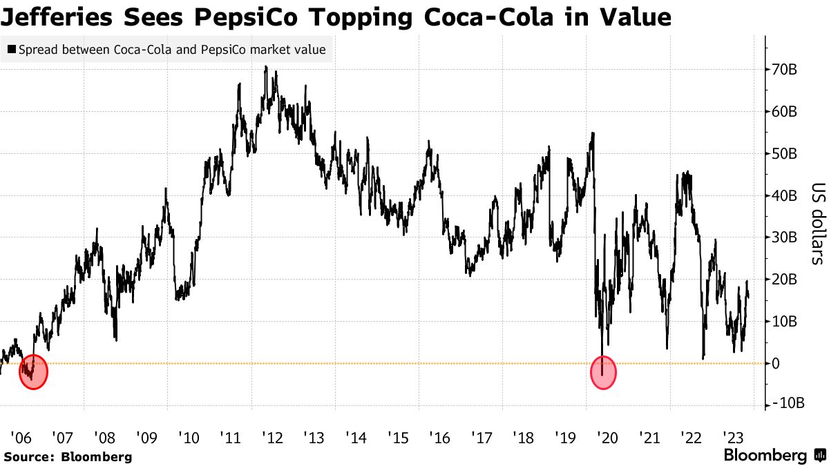 這一觀點得到了高盛集團和高盛集團等公司的分析師的附和,這將標誌着蘇打巨頭的一個顯著逆轉:除了2020年的一天外,自2006年以來,百事公司的價值一直沒有超過可口可樂。截至週一,可口可樂的市值約為2460億美元,比百事公司高出逾150億美元。