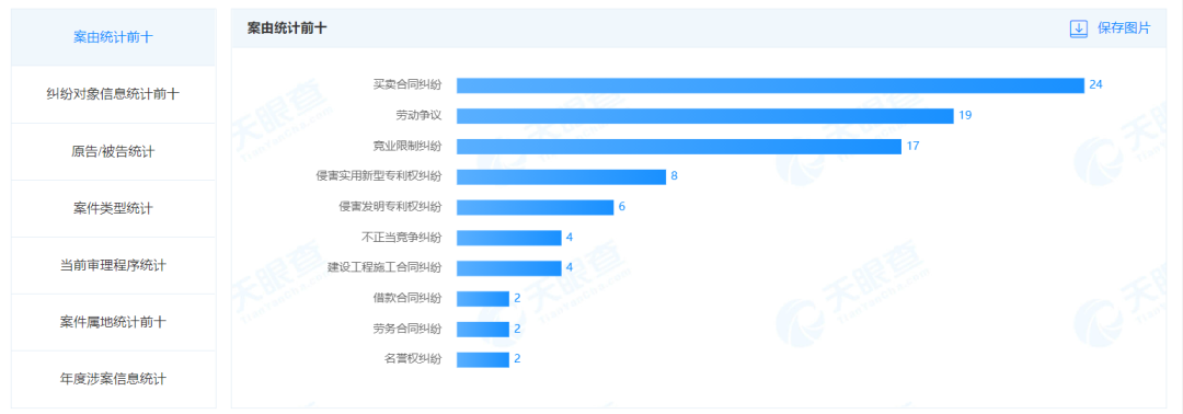 天眼查對於寧德時代的司法解析中,侵害實用新型專利權糾紛的案件有8件,為案由統計第四名;侵害發明專利權糾紛有6件,為案由統計第五名。