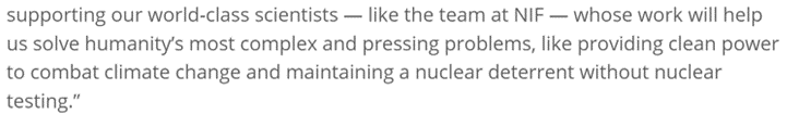 NIF的官方新聞對此其實也直言不諱:“NIF的團隊的工作將幫助我們解決人類最複雜和最緊迫的問題,例如提供清潔能源來應對氣候變化,並在沒有核試驗的情況下保持核威懾力量。”