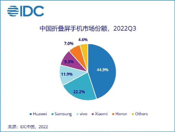 根據IDC中國提供的數據,Q3季度國內摺疊屏手機出貨量超100萬部,華為以44.9%的份額稱霸摺疊屏市場,三星則以22.2%的份額位居第二,緊隨其後的是vivo、小米、榮耀。