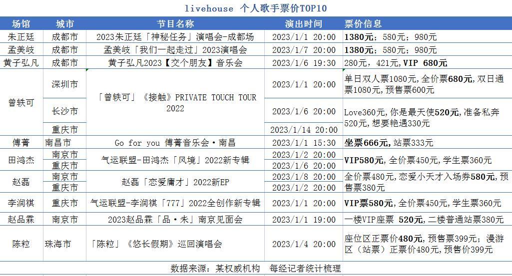 每經記者注意到,自2022年年中開始,Livehouse門票價格便時不時引發爭論。姜雲升“命運Online”2022巡演成都站票價499元、699元的相關消息一度衝上熱搜;告五人樂隊因380元的票價被指“演出刺客”,其門票卻仍在二級市場被炒逾千元;今年元旦,朱正廷“神秘任務”成都場票價有580元、980元、1380元三檔。