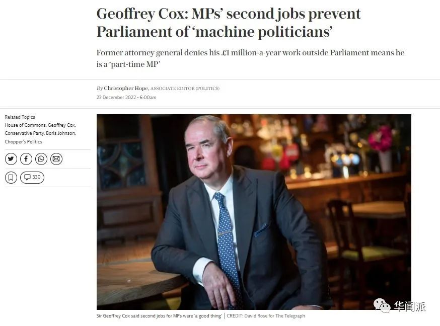 考克斯爵士曾在2018年7月至2020年2月間擔任英國司法大臣一職,他除了每年獲得議員工資收入外,還賺了上百萬鎊的外快。