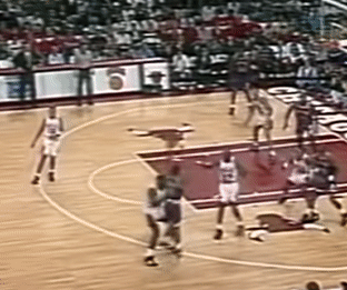 羅德曼卡位,科爾干擾後返位,喬丹罰球線看着,哈珀切割鯊魚給弱側的傳球線路。