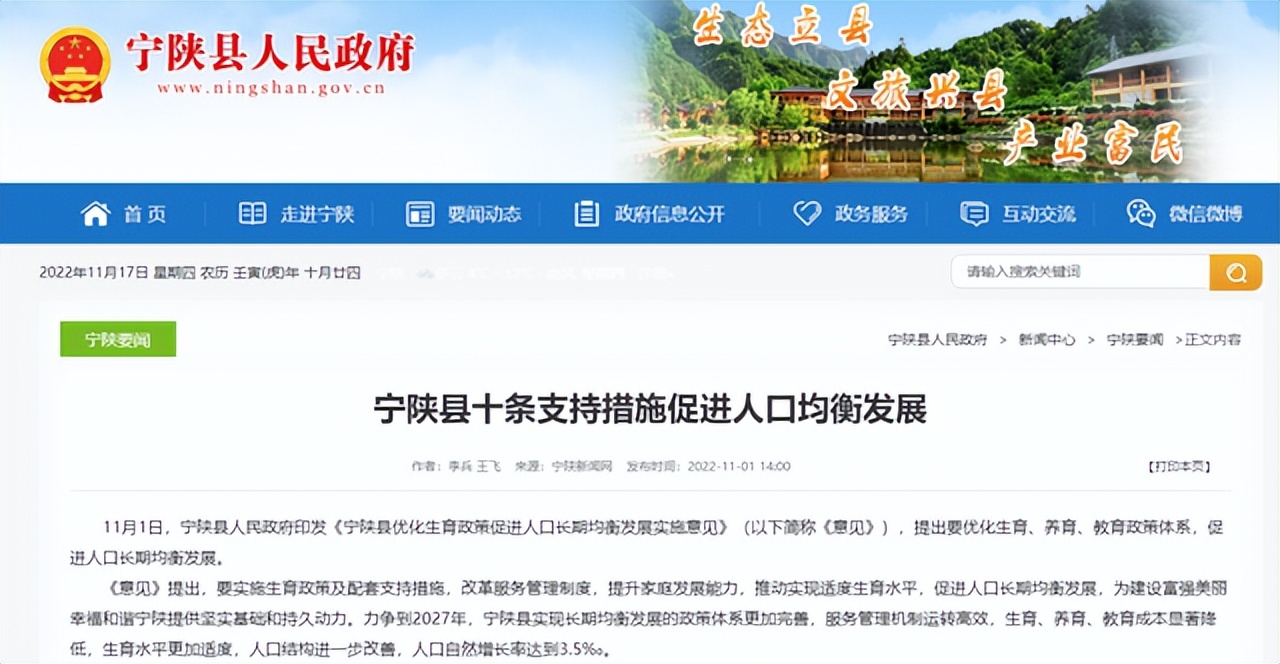去年11月1日,陝西省安康市寧陝縣人民政府印發《寧陝縣優化生育政策促進人口長期均衡發展實施意見》,提出優化生育、養育、教育政策。