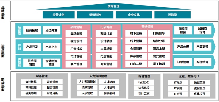 而企業運營體系也包含三個層面:首先從橫向看主要包括加盟商管理、產品管理、供應鏈管理三個版塊。同時從縱向來看,企業的品牌營銷、門店籌建與運營管理縱向覆蓋了業務運營的每個版塊。