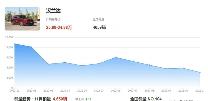 豐田的神車漢蘭達,在去年某月跌破4700台,十年來前所未有的銷量低迷,甚至還不如2009年剛入華時候的成績。