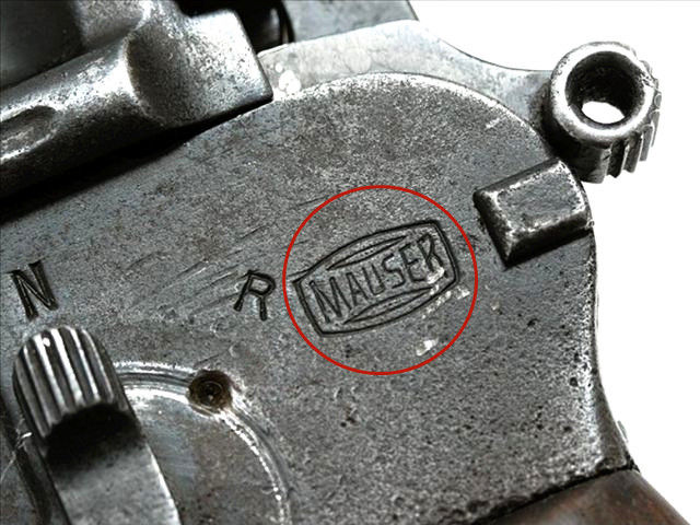 一看商標。毛瑟手槍的商標就是“MAUSER”,大名鼎鼎,雖不同型號的字體形狀略有區別,背景圖案也略有區別,但絕大多數總是那幾個字母。M1930快慢機也不例外。