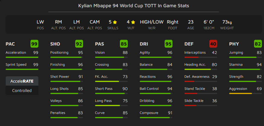 雖然在世界盃上,登貝萊的表現平平無奇,甚至有點坑,但遊戲中登貝萊卻成了性價比神卡,雖然總評只有 82,但因為擁有 90 的速度,而且他的花式能力和逆足能力都是五星,也就是所謂的五花五逆。