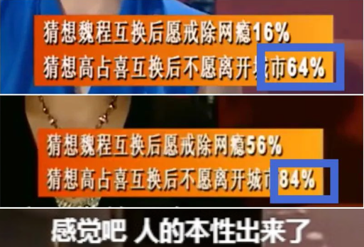當時的《變形計》有一個觀眾們投票環節,有84%的觀眾都認為,高佔喜肯定不願離開城市了,還有的觀眾説,看吧,人貪婪的本性出來了。