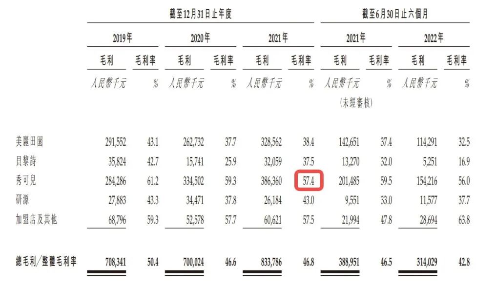 相比之下,醫美業務的盈利能力顯然更為堅挺。同期,秀可兒的毛利率分別為61.2%、59.3%、57.4%和56%;2022年上半年毛利率較2021年僅下降1.4%。
