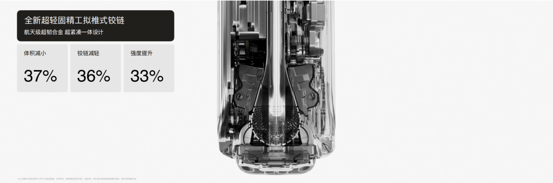 鉸鏈是摺疊機的關鍵部件。Find N2引入了強度更高的航天級MIM超韌合金、高強度複合碳纖維材料,使得鉸鏈變得更輕、更窄、更強。並且在結構上創新性地採用了榫卯工藝和滑軌鏈接替代此前鉚釘的結構形式,鉸鏈零件數量從第一代的136個降到100個,鉸鏈更牢固的同時也變得更輕。