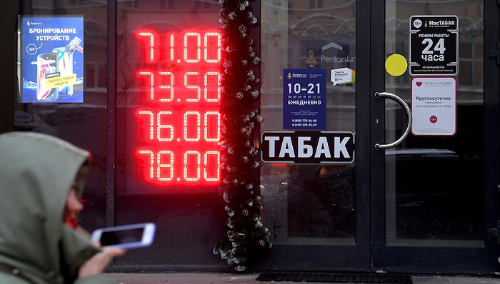 2022年12月21日,俄羅斯莫斯科街頭,一塊顯示歐元和美元對俄羅斯盧布匯率的廣告牌。圖片來源:視覺中國
