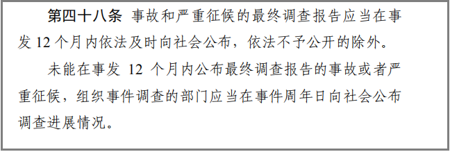 第四十八條規定:“事故和嚴重徵候的最終調查報告應當在事發12 個月內依法及時向社會公佈,依法不予公開的除外。未能在事發 12 個月內公佈最終調查報告的事故或者嚴重徵候,組織事件調查的部門應當在事件週年日向社會公佈調查進展情況。”