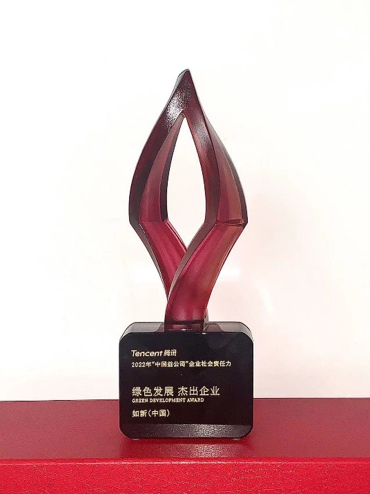 日前,如新中國參加了2022騰訊新聞責任力年度論壇,並榮獲2022 “中國益公司”企業社會責任評選的“綠色發展傑出企業”獎項。 這一獎項是對如新在綠色可持續發展領域長期踐行的認可,也為如新未來繼續推進綠色可持續發展增強了信心。