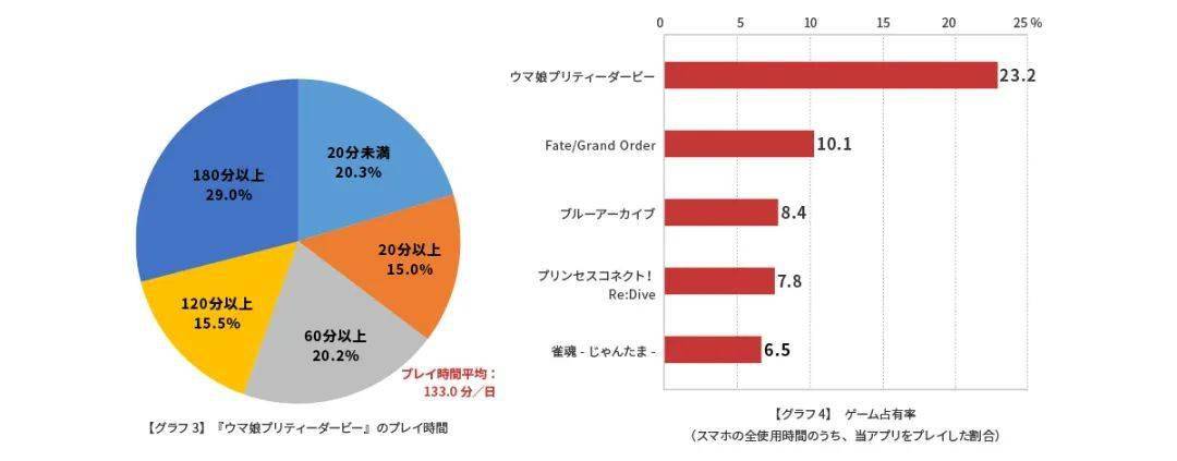 在去年日本GameAge研究所針對日服《賽馬娘》的調查數據中也可以看見這一點。首先是在《賽馬娘》的玩家日均遊戲時間數據上,其日均遊戲時間達到了133分鐘之久,其中更有約29%的玩家日均遊戲時間超多3小時,同時《賽馬娘》在手機上的全天APP運行時長的佔有率也達到了23.%。