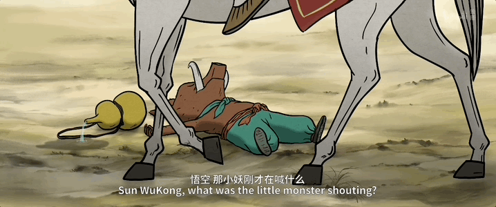 四人中那隻邁着“六親不認”步伐的猴子騰空而起,一棒子下去,小豬妖倒在了地上,媽媽給的水壺也倒在了地上,水漸漸流乾,好像他的生命也隨之消逝。