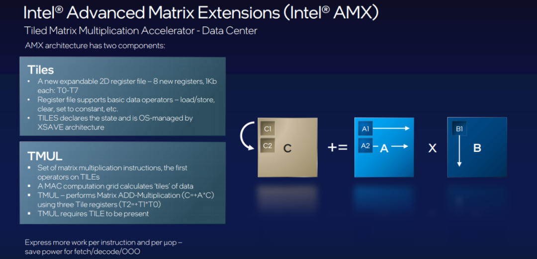 就在大家認為英特爾在 CPU 加速 AI 的技術創新和投入會止步於此的時候,第四代至強可擴展芯片,又帶來了矩陣化的算力支持 ——AMX。