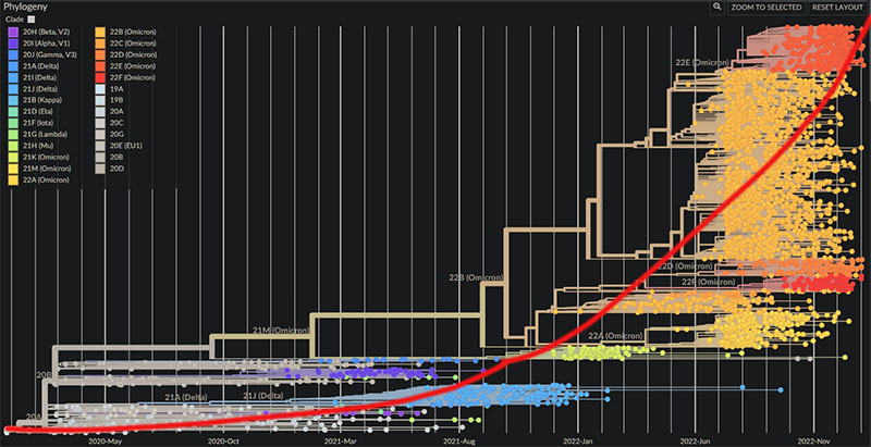 換做放射狀系統發生樹,可以看到所謂的Omicron是個多麼龐大的譜系