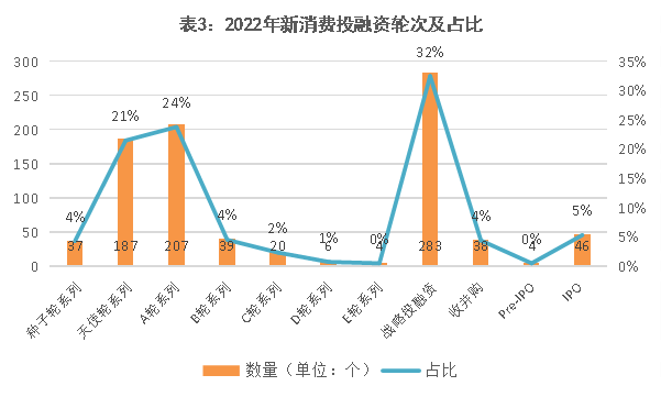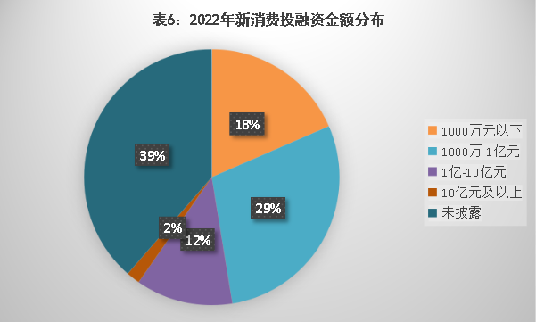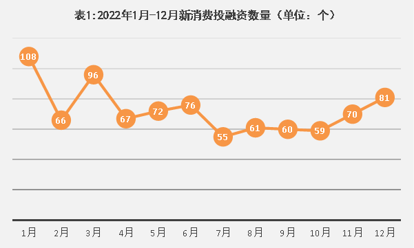 分月度來看,2022年新消費投融資數量呈V字型。考慮到2月春節假期和10月國慶長假,這兩個月的投融資數量處於低位是需要理性看待的。排除長假影響,整體而言,1-3月投融資數量處於相對高位;受疫情等因素影響,4-9月投融資數量下跌並持續遇冷;10月下旬以來,消費投融資出現回暖跡象,反映到數據上,11月-12月迎來連續2個月小幅上漲。