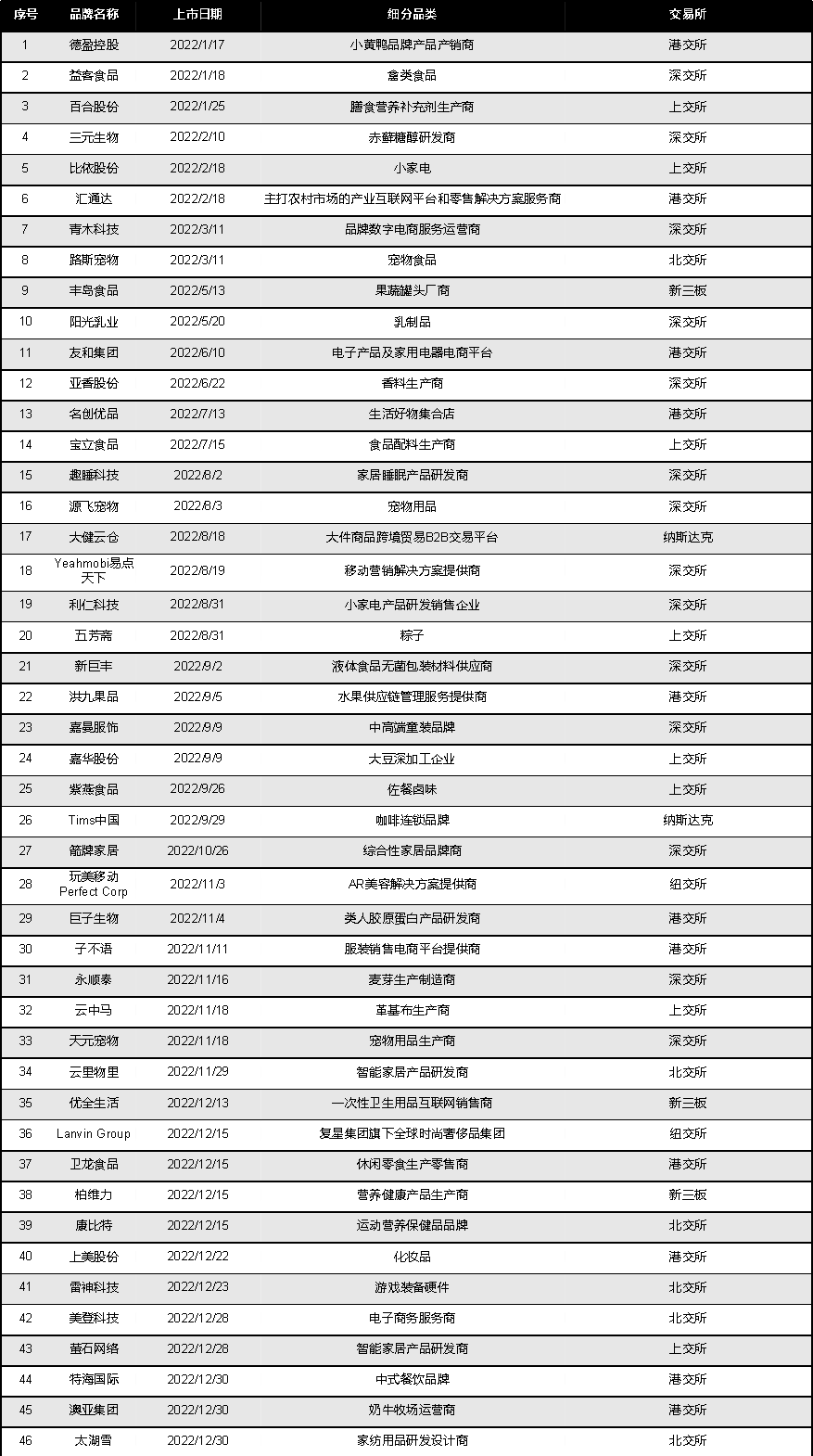 據藍鯊消費不完全統計,2022年,共有46個消費品牌上市,集中在下半年。其中,有31家是在A股上市,11家在港股上市,4家在美國上市。時間分佈上,上半年有12家公司上市,下半年則有34家公司上市,僅12月份的上市公司就是上半年的數量總和。