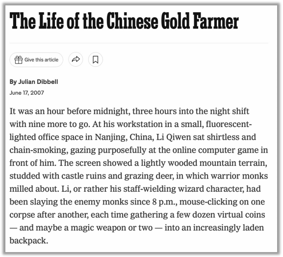 2007年的紐約時報稱當時的魔獸代練為“金農”