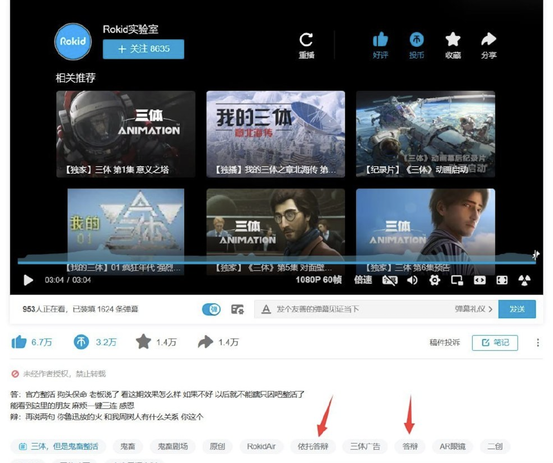 廣告方之一的Rokid實驗室,更是作為甲方,親自下場剪視頻,來罵《三體》動畫為“依託答辯”。