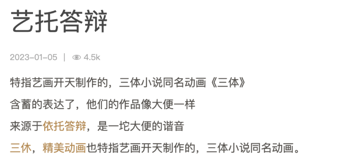 比如找找學術圈、媒體圈的人尬吹一通。這寫來自北京師範大學博士的評論文章,把看過《三體》原著或動畫的人,都看沉默了。