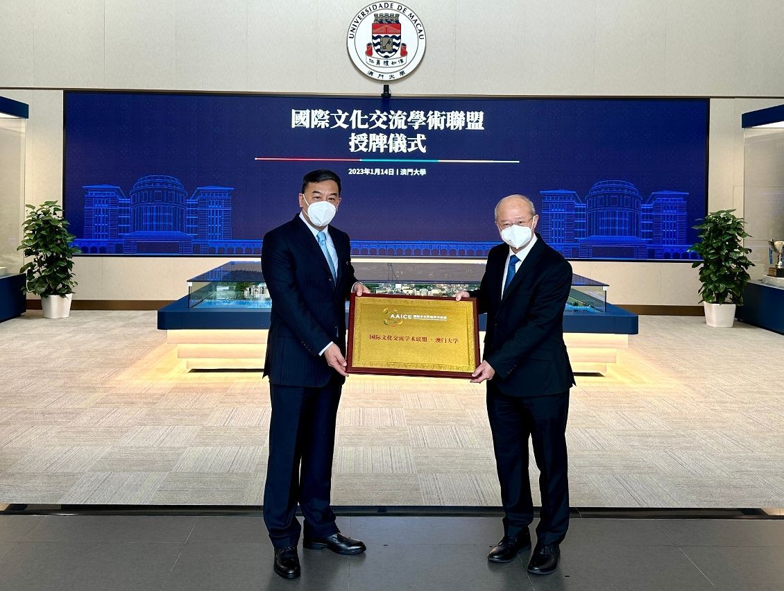 澳門訊 1月14日,澳門大學與中國人民大學簽署《教育和科學合作備忘錄》,同場亦舉行了“國際文化交流學術聯盟”及“世界人文社會科學高校聯盟” 授牌儀式。兩校冀在未來進一步深化交流與合作,充分整合雙方資源與優勢,攜手推動京澳兩地高等教育發展,為國際文化交流以及世界人文社科發展貢獻力量。
