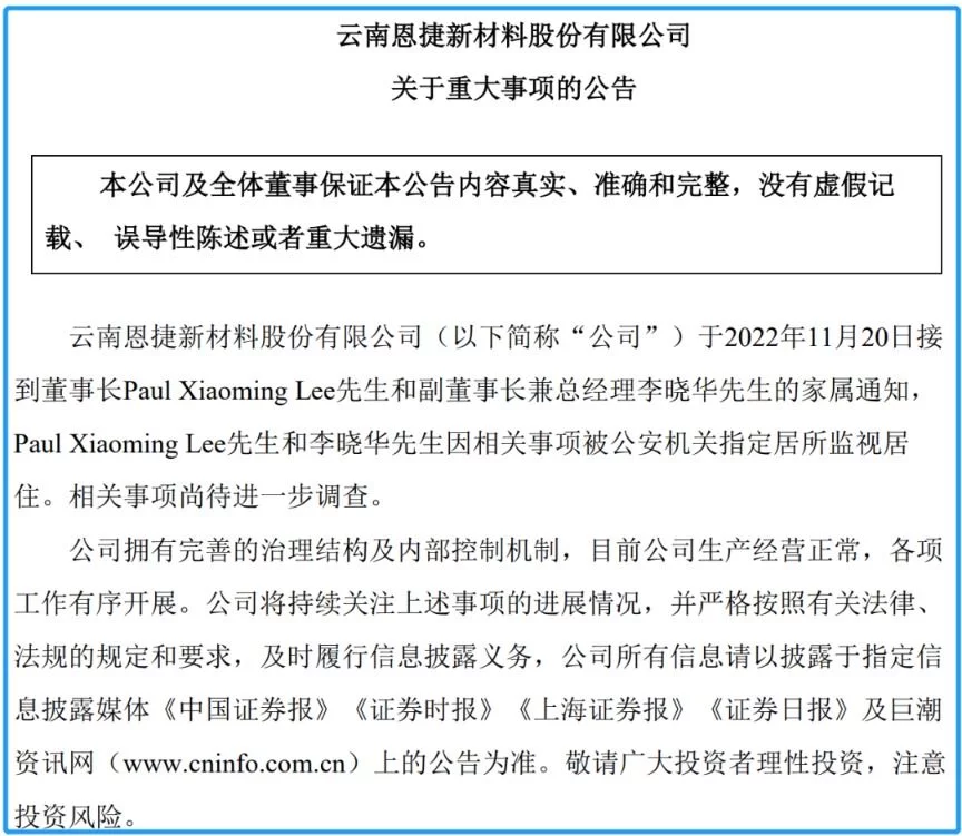 2022年11月20日,雲南昆明市警方,向李曉明、李曉華髮出監視居住的指令。第二天晚上,恩捷股份被迫發佈公告,説在11月20日,接到該公司董事長李曉明的家屬通知,還接到該公司副董事長兼總經理李曉華的家屬通知,以上兩人因為“相關事項”被公安機關指定居所監視居住。“相關事項”有待於進一步調查,目前,公司的經營活動正常。