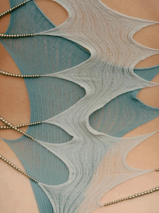 輕薄又極富彈力的針織面料、不規則的破洞設計由一顆顆珍珠串聯,所有的設計語言,其實都在無聲訴説着周睿真正所想要表達的,那是一種雖然纖細、脆弱,卻又極具力量的美的感受。
