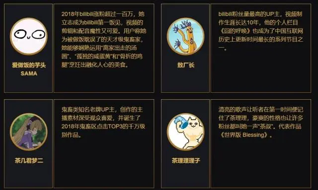 他們回顧了 2018 年的百大名單,認為 2018 年百大 up 要麼是在垂直類分區大殺四方的人,要麼是鎮站級別的 up 主,就算沒看過視頻也覺得眼熟那種。