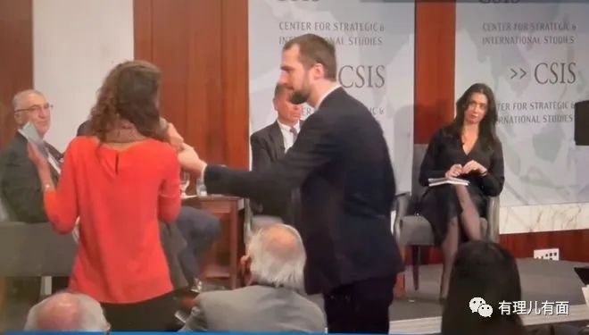 講的真好啊!令台上的CSIS及其贊助商一臉窘態。可惜的是,在女記者提問過程中現場工作人員多次將她的話打斷。更惡劣的是,女記者問題還沒問完,工作人員竟然粗暴地將話筒奪走。
