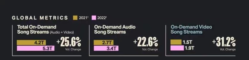 在全球範圍內,2022年按需點播流媒體播放量(音頻+視頻)達到5.3萬億,同比增長25.6%。其中,音頻流媒體同比增長22.6%至3.4萬億,視頻流媒體同比增長31.2%至1.9萬億。