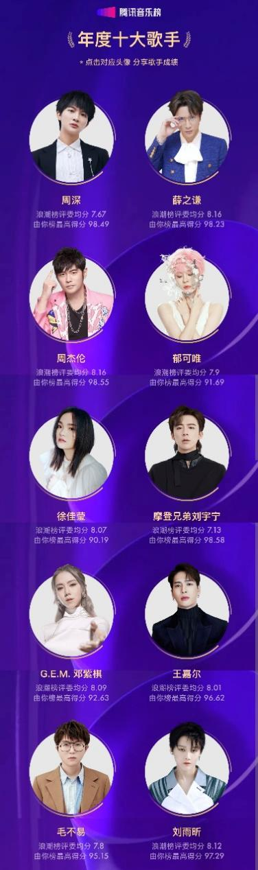 在騰訊音樂浪潮榜年度成績中,周杰倫專輯同名歌曲《最偉大的作品》斬獲最高得分歌曲;G.E.M.鄧紫棋最新專輯《啓示錄》榮獲上榜歌曲數最多的專輯;周深和鬱可唯成為上榜歌曲最多的歌手;單依純則是最年輕的上榜和冠軍歌手。
