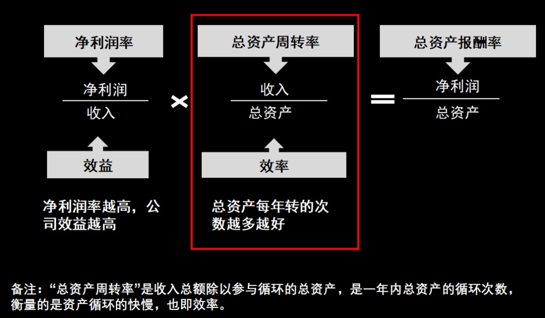 效率是總資產的週轉率,就是企業的收入除以企業的總產值,即總資產循環的次數,企業資產循環次數就叫效率。極致效率從財務上講,是總資產的週轉率,淨利潤率乘以總資產的週轉率等於總資產的報酬率。