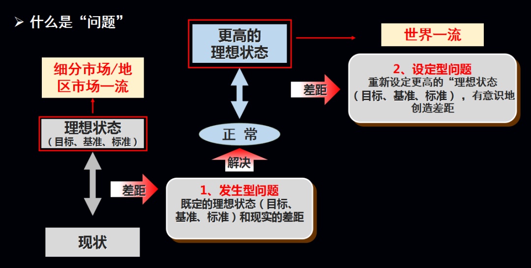 先來了解“問題”的概念,問題可以分為兩類,一類叫發生型問題,另一類叫設定型問題,主要是指企業現狀和理想狀態的差距。理想狀態包括目標、基準或標準。當我們達到目標,就算是解決了問題,達成某一目標後,我們會制定更高的理想狀態,繼而又產生差距,即產生新的問題。