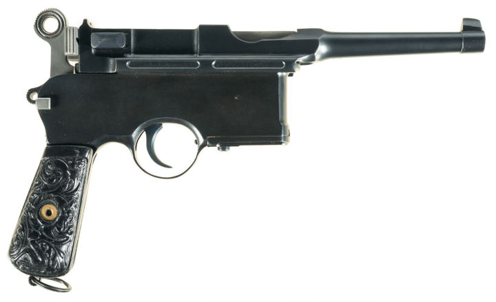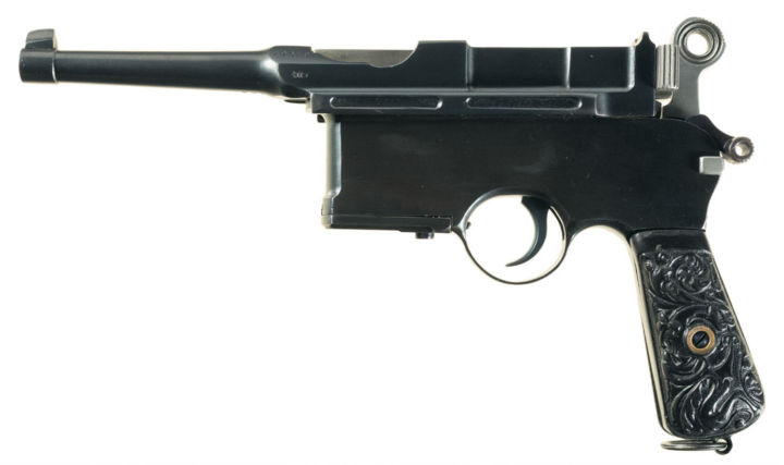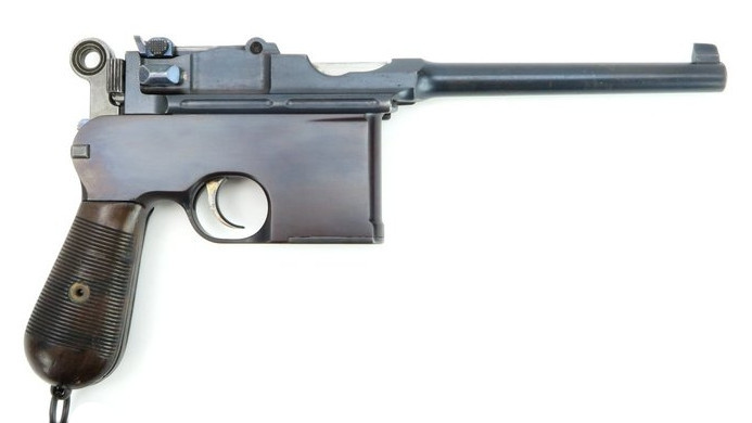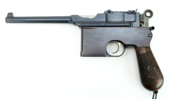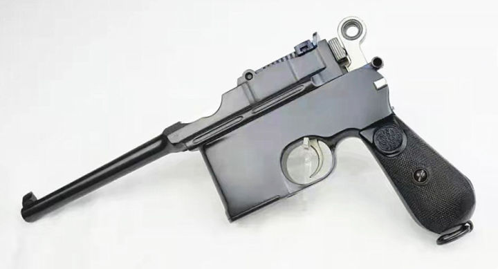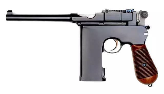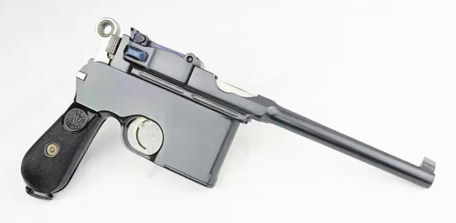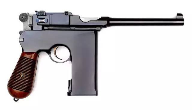 這不是毛瑟駁殼槍的最初樣式。毛瑟C96手槍——俗稱的駁殼槍——於1895年研發成功,1896年定型開始批量生產,最初的批量生產型,是這個模樣: