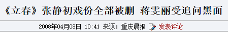 哪怕不是電影行業從業人員,提到張靜初的名字除了她的代表作,或多或少都聽説過她與提攜自己的導演好像發生了點什麼,然後得罪導演原配夫人遭遇封殺,某部電影拍好的戲份被刪得一乾二淨。