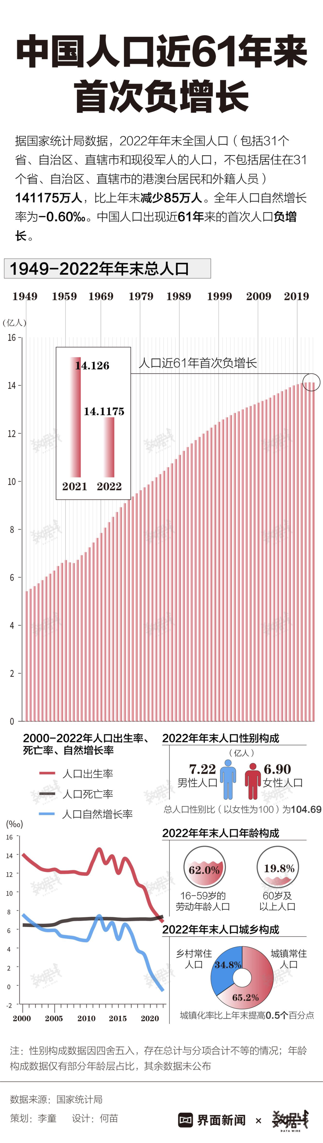 2022年末全國人口(包括31個省、自治區、直轄市和現役軍人的人口,不包括居住在31個省、自治區、直轄市的港澳台居民和外籍人員)141175萬人,比上年末減少85萬人。