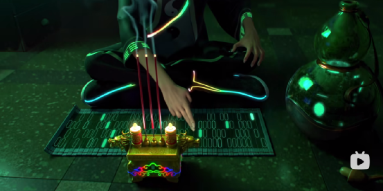 比如短片《界》中,女主李未眼中閃過的卦象,是離坎卦,不僅暗示了李未人工智能的身份,還預示了她最終的抉擇,而城市霓虹燈和試驗枱顯示器上面佈滿的篆體文字,也讓這個現代城市有了滿滿的中華文化風。